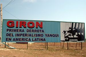 ملصق دعاية كوبية في هافانا يصور جندي كوبي يتعامل مع العم سام الذي يهدده. الترجمة تقول: "حضرات الإمبرياليين، ليس لدينا أي خوف منكم."