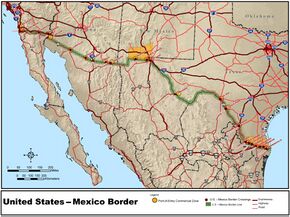 عام 2017، كان 47% من المهاجرين غير الشرعيين في الولايات المتحدة ينحدرون من المكسيك.[63] أقامت الولايات المتحدة جداراً على جزء كبير من حدودها مع المكسيك.[64]
