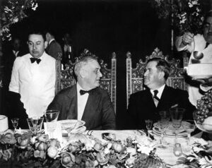زعيم الأغلبية بمجلس الشيوخ الأمريكي ليندون جونسون والرئيس الأمريكي السابق هاري ترومان يتناولان العشاء برفقة الرئيس المكسيكي أدولفو لوپيز ماتيوس عام 1959.