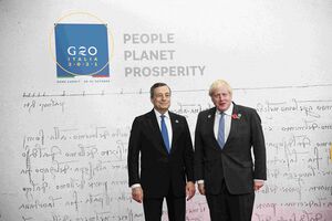 Italian Prime Minister Mario Draghi and British Prime Minister Boris Johnson at the 2021 G20 Rome summit.