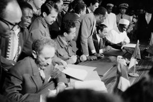 توقيع اتفاقية لحل مشكلة الحدود بين المغرب والجزائر، في باماكو، مالي، 31 أكتوبر 1963. من اليسار: الامبراطور هايله سلاسي، أحمد بن بلة (وخلفه عبد العزيز بوتفليقة، رئيس الجزائر الحالي)، الحسن الثاني، ثم أمادو سيكوتوري رئيس مالي. حيث تم الاتفاق على انسحاب كل من الطرفين من المنطقة الحدودية المتنازع عليها تحت رقابة إثيوپيا . ثم في 18 نوفمبر 1963 بمؤتمر منظمة الوحدة الأفريقية تم الاتفاق على تكوين هيئة تحكيم للفصل في المسألة.[1]