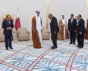 مراسم استقبال الرئيس السيسي في قطر، أقصى اليسار الرئيس السيسي، أمير قطر ووزير الخارجية المصري سامح شكري، يظهر على أقصى يمين الصورة رئيس المخابرات المصرية اللواء عباس كامل.