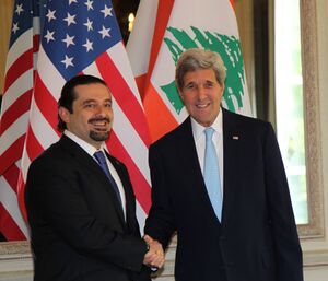 وزير الخارجية الأمريكي جون كيري وزعيم تيار المستقبل اللبناني رفيق الحريري عام 2014.