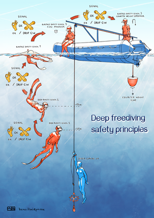 Failing to respond to physiological warning signals, or crossing the mental barrier by strong will, may lead to blackout underwater or on reaching the surface.[10][64] Trained freedivers are well aware of this and competitions must be held under strict supervision and with competent first-aiders on standby.[65] However, this does not eliminate the risk of blackout. Freedivers are encouraged by certification and sporting organisations to dive only with a 'buddy' who accompanies them, observing from in the water at the surface, and ready to dive to the rescue if the diver loses consciousness during the ascent. This is only reasonably practicable if the water clarity allows observation, and the buddy is capable of safely reaching the diver.[بحاجة لمصدر] Due to the nature of the sport, the risks of freediving can be reduced by strict adherence to safety measures as an integral part of the activity, but cannot be eliminated. Competition rules may require all participants to be adept in rescue and resuscitation.[بحاجة لمصدر]