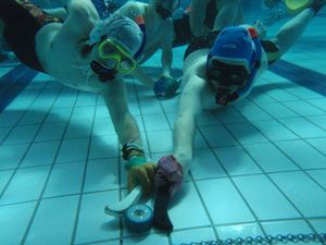 Underwater football is a two-team underwater sport that shares common elements with underwater hockey and underwater rugby. As with both of those games, it is played in a swimming pool with snorkeling equipment (mask, snorkel, and fins). The goal of the game is to manoeuvre (by carrying and passing) a slightly negatively buoyant ball from one side of a pool to the other by players who are completely submerged underwater. Scoring is achieved by placing the ball (under control) in the gutter on the side of the pool. Variations include using a toy rubber torpedo as the ball, and weighing down buckets to rest on the bottom and serve as goals.[بحاجة لمصدر]