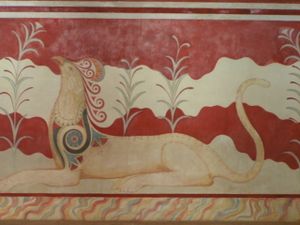 Griffin-type animals appeared in the art of ancient Crete in the MM III Period (1650–1600 BC) in Minoan chronology, found on sealings from Zakro and miniature frescos dated to this period.[73] One early example of griffin-types in Minoan art occurs in the 15th century BC frescoes of the Throne Room of the Bronze Age Palace of Knossos, as restored by Sir Arthur Evans.