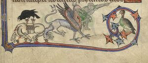 By the 12th century, the appearance of the griffin was substantially fixed: "All its bodily members are like a lion's, but its wings and mask are like an eagle's."[138] It is not yet clear if its forelimbs are those of an eagle or of a lion. Although the description implies the latter, the accompanying illustration is ambiguous. It was left to the heralds to clarify that.