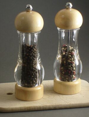 Pepper loses flavour and aroma through evaporation, so airtight storage helps preserve its spiciness longer. Pepper can also lose flavour when exposed to light, which can transform piperine into nearly tasteless isochavicine.[54] Once ground, pepper's aromatics can evaporate quickly; most culinary sources recommend grinding whole peppercorns immediately before use for this reason. Handheld pepper mills or grinders, which mechanically grind or crush whole peppercorns, are used for this as an alternative to pepper shakers that dispense ground pepper. Spice mills such as pepper mills were found in European kitchens as early as the 14th century, but the mortar and pestle used earlier for crushing pepper have remained a popular method for centuries, as well.[55]