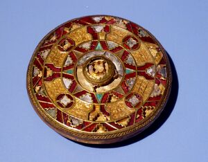 In 2009 the Staffordshire hoard, a major hoard of over 1,500 fragments of 7th and ?8th century metalwork pieces, mostly gold and military in nature, many with gold and garnet cloisonné inlays of high quality, was found by a metal-detectorist in Staffordshire, then in Mercia.[25] Jewellery is far more often found from burials of the early pagan period, as Christianity discouraged grave-goods, even the personal possessions of the deceased.[26] Early Anglo-Saxon jewellery includes various types of fibulae that are close to their Continental Germanic equivalents, but until Sutton Hoo rarely of outstanding quality, which is why that find transformed thinking about early Anglo-Saxon art. Objects from the Royal Anglo-Saxon tomb in Prittlewell in Essex, dating from the late 6th century and discovered in 2003, were put on display in Southend Central Museum in 2019.