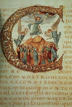 Drogo Sacramentary, c. 850: a historiated initial 'C' contains the Ascension of Christ. The text is in gold ink.