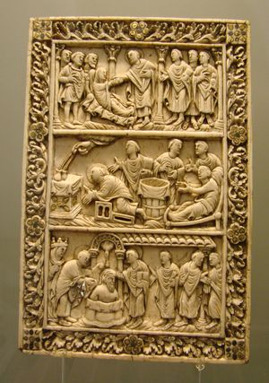 Ivory plaque, probably from a book cover, Reims late 9th century, with two scenes from the life of Saint Remy and the Baptism of Clovis