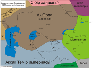 Because Orda and his descendants ruled the left division of the Golden Horde, they were called Princes of the left wing or of the left hand.[3] Initially it covered the western part of the territory ruled by the Jochids and included western Central Asia and south-western Siberia. The capital of the White Horde was originally at Lake Balkhash, but later moved to Sygnaq, Kazakhstan on the Syr-Darya River.[4]