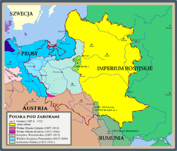 During the reign of Alexander I of Russia, Poles and Lithuanians prevailed in the western provinces. After 1819, Grodno, Vilnius (rus. Vilna, pol. Wilno), Minsk, Volhynia (pol. Wołyń), Podolia (pol. Podole) governorates and the Belostok Oblast remained under the chief administrative management of the Grand Duke Konstantin Pavlovich of Russia. All positions of the local administration were dominated by the Polish (pol. szlachta) and Lithuanian nobility, which had there a wide local government and enjoyed many social, economic and military privileges, unlike noble families in the so-called Congress Poland.[3] This opportune situation changed dramatically as the November Uprising and later the January Uprising had broken out in 1830[4] and 1863 respectively and both failed in effort to restore an independent state which would have been a kind of successor to the Polish–Lithuanian Commonwealth.[5][6]
