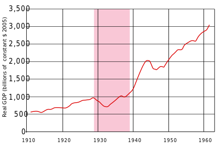 | الأحداث الرئيسية | Wall Street Crash of 1929 Smoot-Hawley Tariff Act Widespread bank failures Hitler's rise to power Dust Bowl New Deal Recession of 1937–1938 Depopulation of the Great Plains | ||