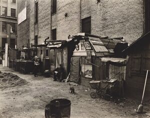 Homeless individuals that did not stay in shelters sometimes stayed in shantytowns, or “Hoovervilles” (named after Herbert Hoover, the president in office when the Depression began). These “Hoovervilles” were self-made communities of homeless people that followed their own rules and established their own society. Men, women, and even some children lived in these shantytowns and people from all different types of socio-economic backgrounds lived together, which was very uncommon during the time of segregation. [32]