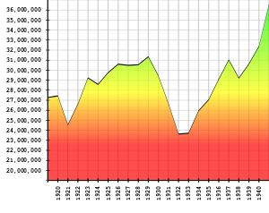 The unregulated growth of small rural banking institutions can be partially attributed to the rising cost of agriculture especially in the Corn Belt and Cotton Belt. Throughout the corn and cotton belts real estate increases drove the demand for more local funding to continue to supply rising agricultural economics. The rural banking structures would supply the needed capital to meet the farm commodity market, however, this came with a price of reliability and low risk lending. Economic growth was promising from 1887 to 1920 with an average of 6 percent growth in GDP. In particular, the participation in World War I drove a booming agricultural market that drove optimism at the consumer and lending level which, in turn, resulted in a more lax approach in the lending process. Over banked conditions existed which pressured struggling banks to increase their services (specifically to the agricultural customers) without any additional regulatory oversight or qualifications. This dilemma introduced several high-risk and marginal business returns to the banking market.[16] Banking growth would continue through the first two decades well outside of previous trends disregarding the current economic and population standards. Banking profitability and loan standards begin to deteriorate as early as 1900 as a result.