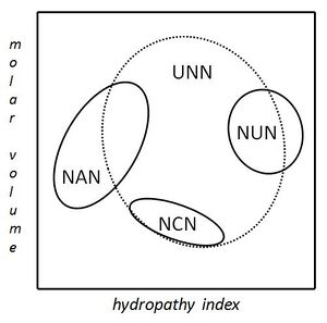 Grouping of codons by amino acid residue molar volume and hydropathy.