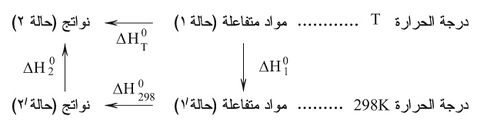 تتأثر كميتا حرارة التفاعل بدرجة الحرارة التي يجري التفاعل عندها، وهي عموماً الدرجة 298K أما التفاعلات التي تجري عند درجات حرارة أخرى فيمكن حساب قيم الأنطلبية أو تغير الطاقة الداخلية المرافقة لها بالاستفادة من مخططات هِس كما سبق:الشكل (6)