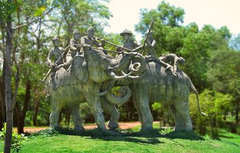 The Jan. 1593 single combat, using war elephants, between Siamese King Naresuan and the Burmese crown prince Crown Prince Minchit Sra - still celebrated in Thai history (statue in Samut Prakan Province, تايلند).