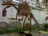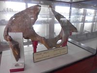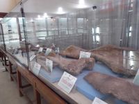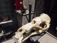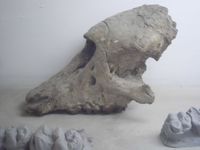 نموذج لجمجمة فيل ماقبل التطور وتمثال مصغر لديناصور من اكلة العشب ، في المتحف الجيولوجي المصري قام بهما الفنان مجدي ميخائيل مقار، سنة 2013.