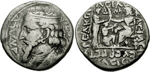Coin of Artabanus II of Parthia (c. 128–124 BC). The Hellenistic depiction on the reverse shows the king kneeling before an Apollo-like god, which is thought to be Mithra.[5]