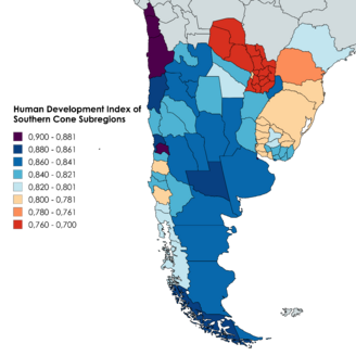 The Southern Cone is the subregion in Latin America with the highest Human Development Index, and it has historically had a high standard of living; it's located at latitudes in the southern hemisphere that would correspond in the northern hemisphere to the United States, Canadian provinces, European countries (except the Nordic countries), northern China, the Korean Peninsula and Japan.[2][3]