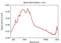 رسم بياني يوضح كثافة الأجسام الفضائية الإصطناعية مقارنة ببعد مدارها عن الأرض. ويلاحظ أن معظم الأجسام تقع على بعد 800-1500 كم من الأرض وهذا المدار يعتبر الأهم لسواتل والمحطات الفضائية