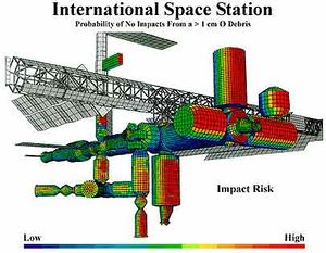 صورة توضح إحتمالية إصابة محطة الفضاء الدولية بالمخلفات الفضائية. اللون الأحمر يعبر عن إحتمالية إصابة عالية بينما اللون الأزرق يعبر عن إحتمالية منخفظة