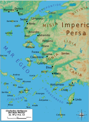 وقد نبغ في مدينة ملطية Milet، على هذا الساحل، منذ القرن السادس قبل الميلاد ثلاثة فلاسفة ألفوا ما يطلق عليه اسم مدرسة ملطية، وذلك ضمن الإطار الواسع للمدرسة الإيونية. وهم طاليس Thales وتلميذه أنكسيمندر Anaximandre، وتلميذه الأخير أنكسيمانس Anaximène. وتشمل المدرسة الإيونية بالإضافة إلى الفلاسفة الثلاثة السابقين عدداً آخر من الفلاسفة مثل زنوفانس Xénophane، وهراقليطس Heraclite من مدينة إفسس Ephèse.