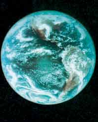 صورة ضوئية للأرض ملتقطة من ارتفاع 35,900كم تبين أنماط الغيوم. والكتلة الكبيرة من اليابسة في قمة الصورة في أمريكا الشمالية.