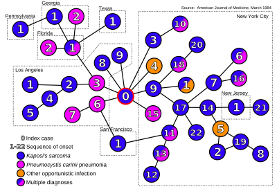 A now disproven 1984 paper[14] linked 40 AIDS patients by sexual contact. Of those patients, Dugas was supposedly the first to experience an onset of symptoms of AIDS. In the above graph, Dugas is represented by the circle labeled 0, highlighted in red.