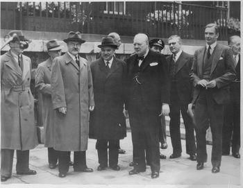 رئيس الوزراء ونستون تشرشل مع أعضاء الوفد السوڤيتي في حديقة 10 داوننگ ستريت بعد توقيع معاهدة التعاون. لندن، 26 مايو 1942
