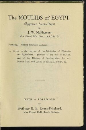 الموالد فى مصر كتاب للإنجليزي جوزيف وليام ماكفرسون والذي عمل في مصر لأكثر من 25 عاماً، يتناول ظاهرة الموالد في مصر، والذي يرى أن الموالد ظاهرة اجتماعية عريقة في القدم، ترجع أصولها إلى احتفال المصريين القدماء بأعياد آلهتهم - مثل أوزيريس وعيد عروس النيل وغير ذلك من الأعياد السنوية التي يمكن اعتبارها موالد من باب التجوز. إنما ظهرت الموالد - بمعناها المتعارف عليه الآن - في مصر الإسلامية في القرن السابع الهجري (الثالث عشر الميلادي)؛ وقد كانت في أول أمرها احتفالات دينية شعبية محضة، ثم أخذت تكتسب الصفة الرسمية بعد ذلك شيئا فشيئا ابتداء من القرن التاسع الهجري.