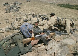 According to Pakistani Afghanistan expert Ahmed Rashid, "between 1994 and 1999, an estimated 80,000 to 100,000 Pakistanis trained and fought in Afghanistan" on the side of the Taliban.[94] Peter Tomsen stated that Pakistani military and ISI officers along with thousands of regular Pakistani Armed Forces personnel had been involved in the fighting in Afghanistan.[95] In 2001 alone, according to several international sources, 28,000–30,000 Pakistani nationals, 14,000–15,000 Afghan Taliban and 2,000–3,000 Al Qaeda militants were fighting against anti-Taliban forces in Afghanistan as a roughly 45,000-strong military force.[66][77][96][97] Pakistani President Pervez Musharraf – then as Chief of Army Staff – was responsible for sending thousands of Pakistanis to fight alongside the Taliban and Bin Laden against the forces of Massoud.[66][67][98] Of the estimated 28,000 Pakistani nationals fighting in Afghanistan, 8,000 were militants recruited in madrassas filling regular Taliban ranks.[77] A 1998 document by the U.S. State Department confirms that "20–40 percent of [regular] Taliban soldiers are Pakistani."[67] The document further states that the parents of those Pakistani nationals "know nothing regarding their child's military involvement with the Taliban until their bodies are brought back to Pakistan."[67] According to the U.S. State Department report and reports by Human Rights Watch, the other Pakistani nationals fighting in Afghanistan were regular Pakistani soldiers especially from the Frontier Corps but also from the Pakistani Army providing direct combat support.[67][99]