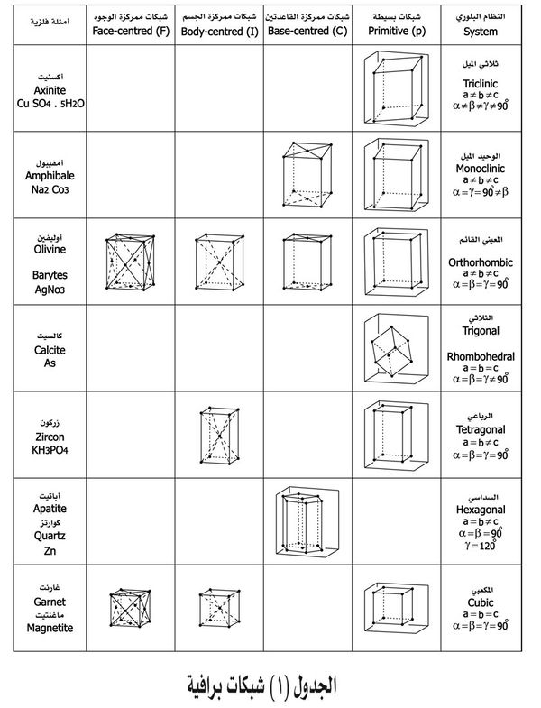 تصنف البلورات تبعاً لثوابتها الهندسية وعناصر التناظر فيها، في سبعة أنظمة بلورية (انظر الجدول ـ1).