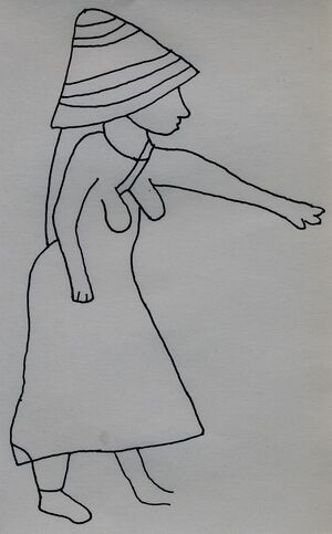 Several representations are particularly noteworthy. At station VIII (Ahana Rock), a bell-shaped head (about 70 cm high) is surmounted by a bun, tight at the base, from which a sort of tuft in the form of two small opposing horns emerges. At station XXVII a woman (135 cm high) with a cynomorphic profile is holding a smaller character who could be a child. She wears a truncated cone-shaped hat on her head, striped with parallel bands, perhaps of spartan material. The neck seems to be caught in a narrow, elongated straitjacket. On the chest three lines evoke necklaces. The breasts are elongated and pendulous, above a long dress that descends clearly below the ankles.