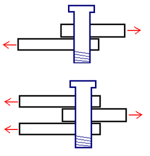 Figure of a bolt in shear. Top figure illustrates single shear, bottom figure illustrates double shear.