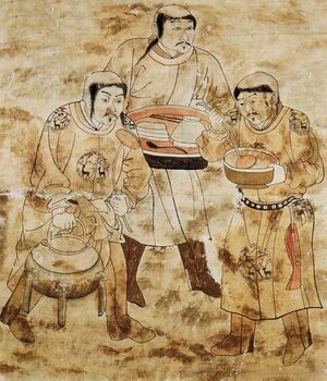 Living in the frigid and windy Northern Desert, the Khitan people made animal husbandry, hunting and fishing their occupations, which could provide them (meat, fish and milk) for food, wool and hides for clothing. They used the horsedrawn cart for their shelters throughout the seasonal migrations.[18]