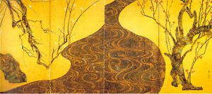 اوگاتا كورين Ogata Korin فنان ياباني ولد في كيوتو Kyoto، وتُوفِّي فيها. اسمه الأصلي أوغاتا كوريتومي Ogata Koretomi، وكورين اسم فرشاته، ودعي أيضاً باسم أوغاتا إتشينوجو Ogata Ichinojo، وهو معروف أنه ابـن مرحلة توكوغاوا (1603 - 1868) Tokugawa وأحد كبار أساتذة مدرسة «سوتاتسو» Sotatsus للتصوير الزخرفي، وقد اشتهر بالتصوير فوق الستائر والحواجز واستعمال طلاء خاص اسمه (ورنيش اللك) laque وبتصميمات رسوم الأقمشة.