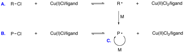 إن جذر الكبريتات الحر يضاف إلى الألكين ليشكل إسترات الكبريتات الجذرية مثل -CHPhCH2OSO3• والذي يضيف إليه ألكيناً آخر عن طريق تشكيل روابط C-C جديدة. إن العديد من بوليمرات الستايرن وفلورو الألكينات تنتج بهذه الطريقة.