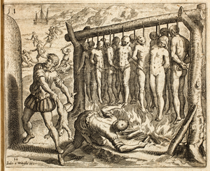 Depiction of Spanish atrocities committed in the conquest of Cuba in Las Casas's "Brevisima relación de la destrucción de las Indias". The print was made by two Flemish artists who had fled the Southern Netherlands because of their Protestant faith: Joos van Winghe was the designer and Theodor de Bry the engraver. |