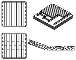 تصنع قطع الأرضية الخشبية البلاطية من خشب البلوط أو الجوز أو غيرهما، وتكون ثخانتها قليلة للأرضية التي تركّب باللصق، وكبيرة للتي تجمع بتعشيق بلاطاتها، ويتم صقلها وطليها في المصنع لتصبح جاهزة للتركيب مباشرة. وأحياناً تصنع الأرضية الخشبية البلاطية مفصلة تفصيلاً خاصاً لأرضية معروفة الأبعاد وبأشكال زخرفية متنوعة، كما هو موضح في الشكل، يُمكن معها قصّ كل بلاطة من بلاطات هذه الأرضية بحسب بعدها وشكلها وموقعها في الأرضية.