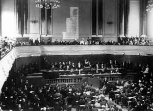 Basel has often been the site of peace negotiations and other international meetings. The Treaty of Basel (1499) ended the Swabian War.[53] Two years later Basel joined the Swiss Confederation.[54] The Peace of Basel in 1795 between the French Republic and Prussia and Spain ended the First Coalition against France during the French Revolutionary Wars.[55] In more recent times, the World Zionist Organization held its first congress in Basel from 29 August through 31 August 1897. Because of the Balkan Wars, the (Socialist) Second International held an extraordinary congress at Basel in 1912.[56] In 1989, the Basel Convention was opened for signature with the aim of preventing the export of hazardous waste from wealthy to developing nations for disposal.[57]