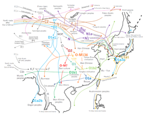 A 2014 DNA analysis found that the Bamar exhibited 'extraordinary' genetic diversity, with 80 different mitochondrial lineages and indications of recent demographic expansion.[20] As the Bamar expanded their presence in the region following their arrival by the 800s, they likely incorporated older haplogroups including those of the Pyu and Mon.[20] Another genetic study of G6PD mutations in Mon and Bamar men found that the two groups likely share a common ancestry, despite speaking languages that belong to different language families.[25] Another 2022 study found that Central and Southern Thais had a large proportion of Bamar-related ancestry (at 24% and 11% respectively), while Bamar ancestry was also detected among the Palaung and Shan groups.[26]