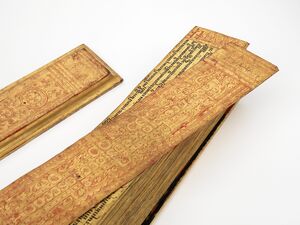 The Bamar traditionally wear sarongs called longyi, an ankle-length cylindrical skirt that is wrapped at the waist.[65] The modern form of the longyi (လုံချည်) was popularised during the British colonial period, and replaced the much lengthier paso (ပုဆိုး) and htamein (ထဘီ) of the pre-colonial era. The indigenous acheik silk textile, known for its colorful wave-like patterns, is closely associated with the Bamar. Formal attire for men includes a longyi accompanied by a jacket called taikpon (တိုက်ပုံ), which similar to the Manchu magua, and a cloth turban called gaung baung (ခေါင်းပေါင်း).[66] Velvet sandals called gadiba phanat (ကတ္တီပါဖိနပ်, also called Mandalay phanat), are worn as formal footwear by both men and women.