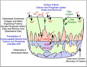 At least one more regulated transport process is involved. The stoichiometry of bone mineral basically is that of hydroxyapatite precipitating from phosphate, calcium, and water at a slightly alkaline pH:[1]