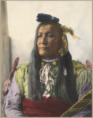 When the Lakota, together with their Cheyenne and Arapaho allies, were fighting the United States Army, they sent runners into Blackfoot territory, urging them to join the fight. Crowfoot, one of the most influential Blackfoot chiefs, dismissed the Lakota messengers. He threatened to ally with the NWMP to fight them if they came north into Blackfoot country again. News of Crowfoot's loyalty reached Ottawa and from there London; Queen Victoria praised Crowfoot and the Blackfoot for their loyalty.[35] Despite his threats, Crowfoot later met those Lakota who had fled with Sitting Bull into Canada after defeating George Armstrong Custer and his battalion at the Battle of Little Big Horn. Crowfoot considered the Lakota then to be refugees and was sympathetic to their strife, but retained his anti-war stance. Sitting Bull and Crowfoot fostered peace between the two nations by a ceremonial offering of tobacco, ending hostilities between them. Sitting Bull was so impressed by Crowfoot that he named one of his sons after him.[36]