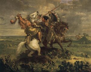 The Death of Omoxesisixany or Big Snake by Paul Kane, depicting a battle between a Blackfoot and Plains Cree warrior on horseback.