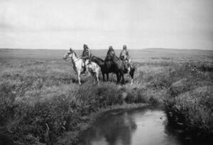 The Plains had covered approximately 780،000 ميل مربع (2،000،000 km2) with the Saskatchewan River to the north, the Rio Grande to the south, the Mississippi River to the east, and the Rocky Mountains to the west.[7] Adopting the use of the horse, the Niitsitapi established themselves as one of the most powerful Indian tribes on the Plains in the late 18th century, earning themselves the name "The Lords of the Plains."[8] Niitsitapi stories trace their residence and possession of their plains territory to "time immemorial."