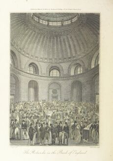 Dividend Day at the Bank, 1770. The Pay Hall of 1732 was one of the Bank's first buildings on Threadneedle Street. (At one time shareholders were required to attend in person for the payment of Government dividends; the practice was abolished in 1910).[25]